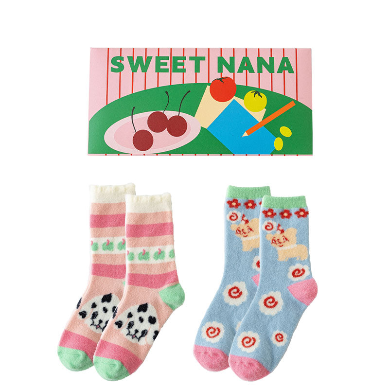 Sweetnana カートゥーンジャカードソックスギフトボックスセットは、遊び心あふれるパターンと心地よい暖かさをミックスしています。各ペアには、ダルメシアン柄、桜、ハッピーフラワーフェイスなどの高精細なジャカードモチーフが、柔らかくふわふわのニット地にあしらわれています。ポリエステルとスパンデックスの混紡素材がやさしく足を包み込み、締め付け感なく、秋冬のルームウェアとして足元を暖かく保ちます。カラフルなSweetnanaギフトボックスに詰められており、誕生日やちょっとしたサプライズにぴったりです。