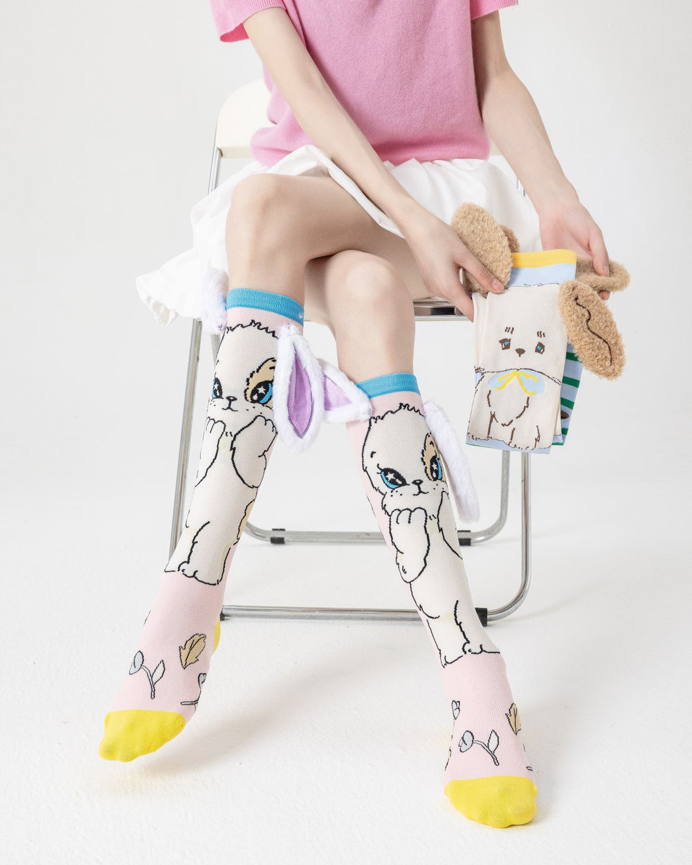 Sweetnana 3D たれ耳うさみみニーハイソックスは、やわらかな質感と愛らしさで視線を惹きつけるようにデザインされています。オーバーサイズでふにゃっと垂れたうさみみと、はにかむカートゥーン風のうさぎイラストを組み合わせ、キュートでありながらやや誇張のある、遊び心と表現力に富んだビジュアルを演出します。