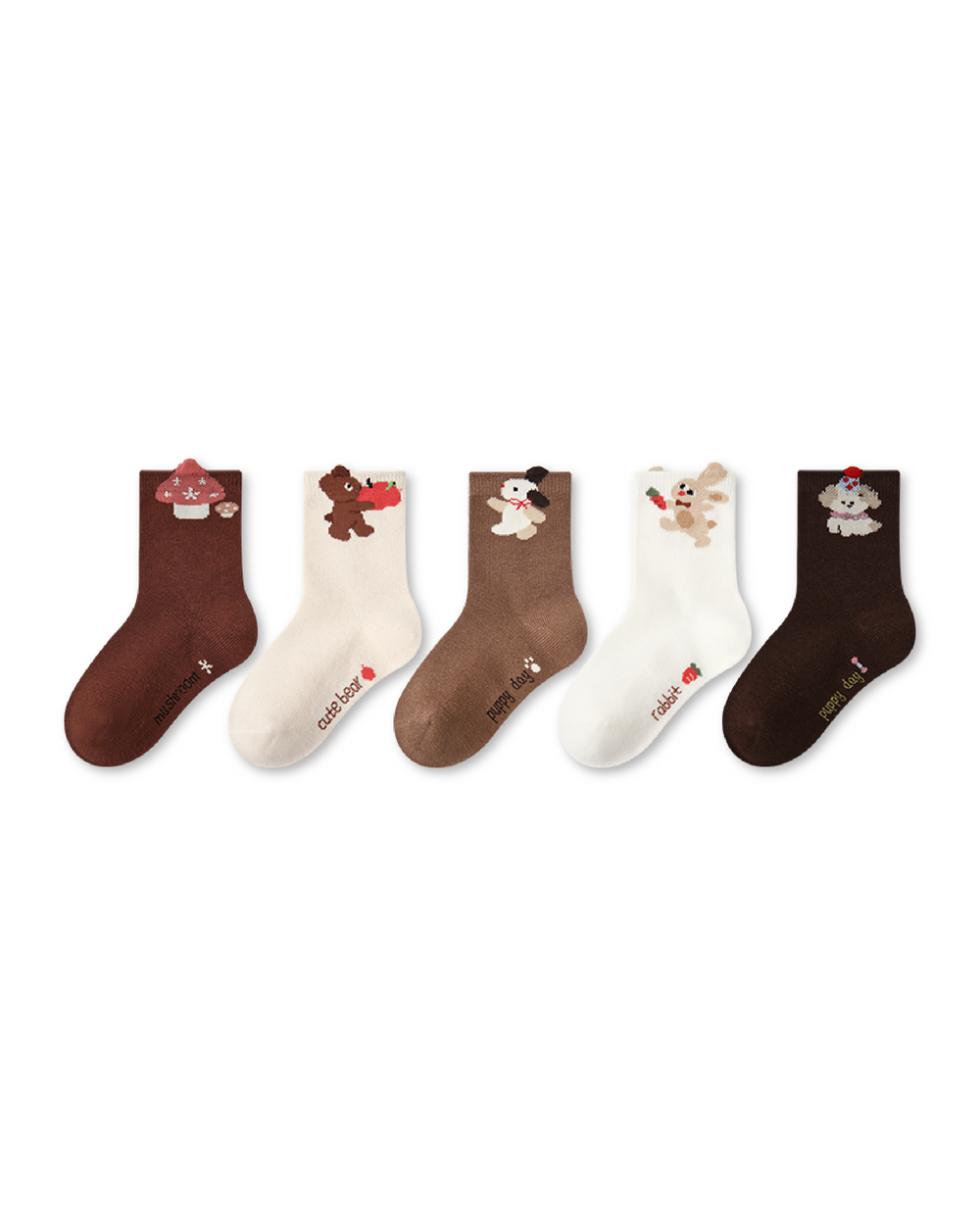 Sweetnana キュートな森の仲間たち クルーソックス セットは、毎日の冒険にぴったりの遊び心あふれるコレクションです。各ペアには、森をテーマにした愛らしいキャラクター—子犬のポートレート、りんごを抱えたクマ、にんじんを持ったウサギ、そして小さなキノコのアクセント—が描かれており、子どもたちのコーデに温かみとウィムジカルな雰囲気を添えます。