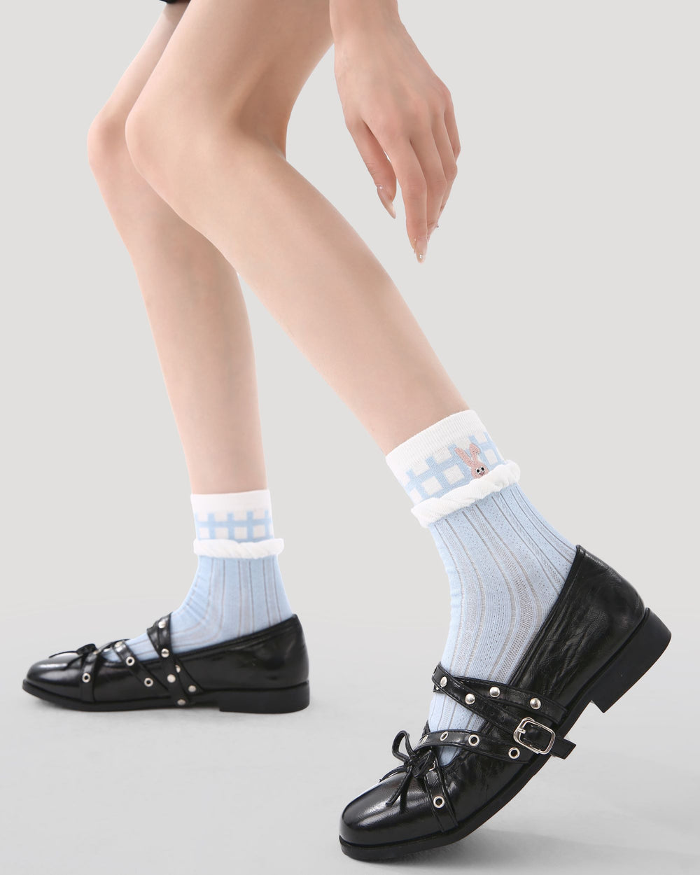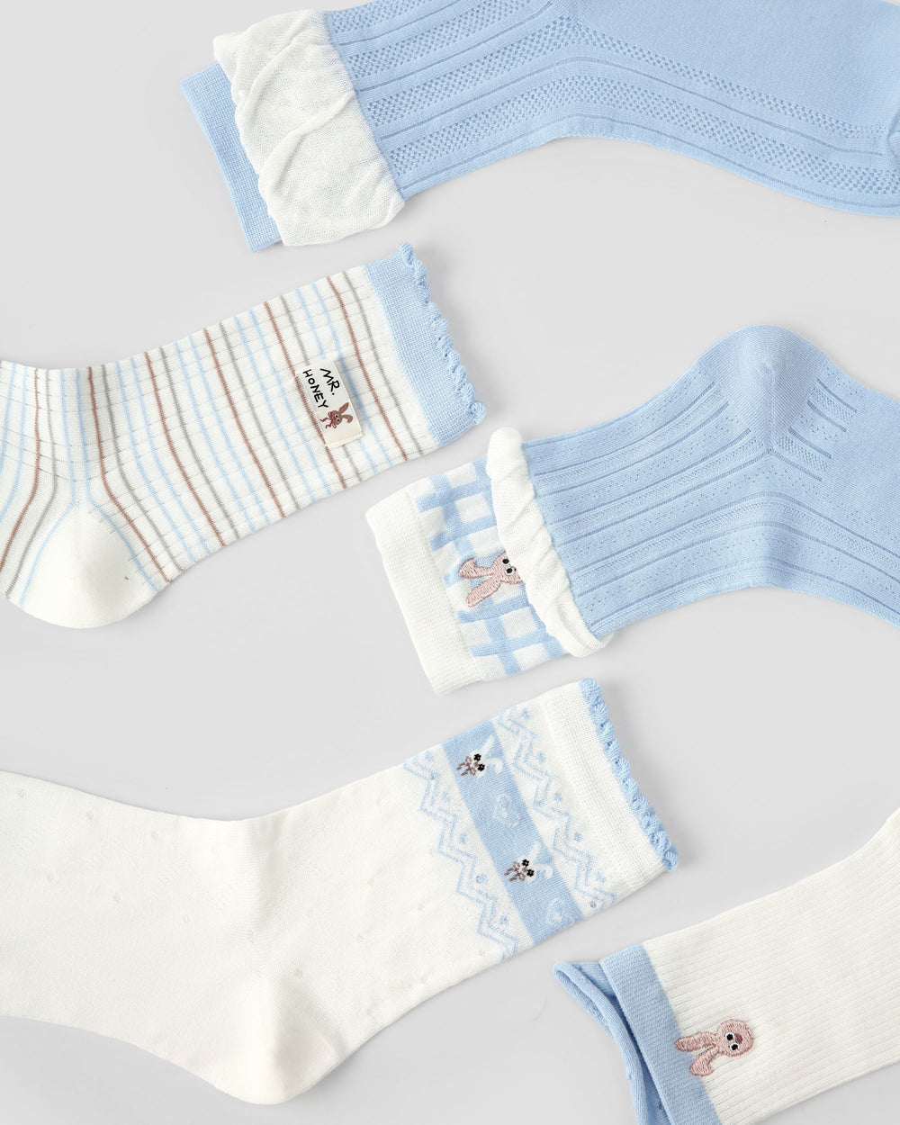 この5足セットは、落ち着いたブルーとアイボリーの配色に、レーストリムの履き口、リブ編みの質感、そしてうさぎの刺繍や小さなハート、さりげないドット、やわらかなストライプといった愛らしいディテールが魅力です。気取りすぎずに、シンプルなフラットシューズやメリージェーン、カジュアルなスニーカーをさりげなく格上げしてくれるソックスです。