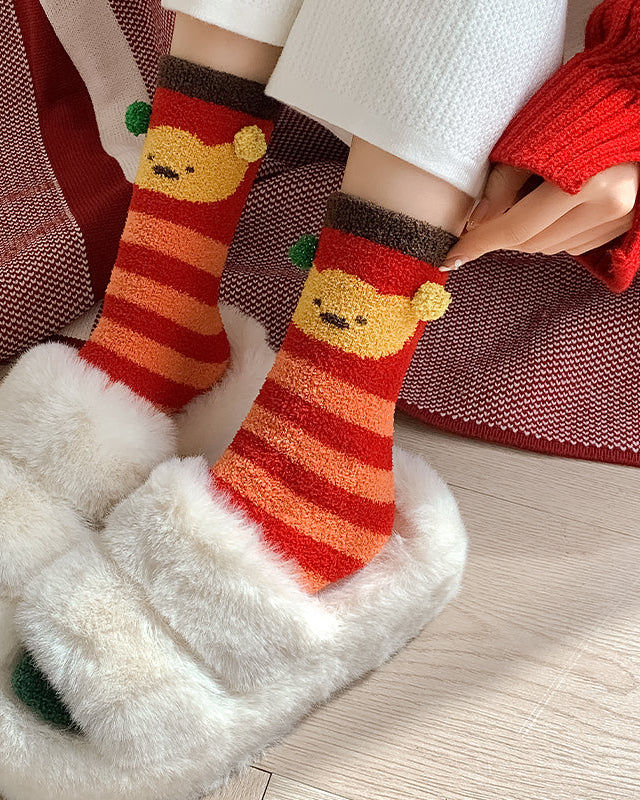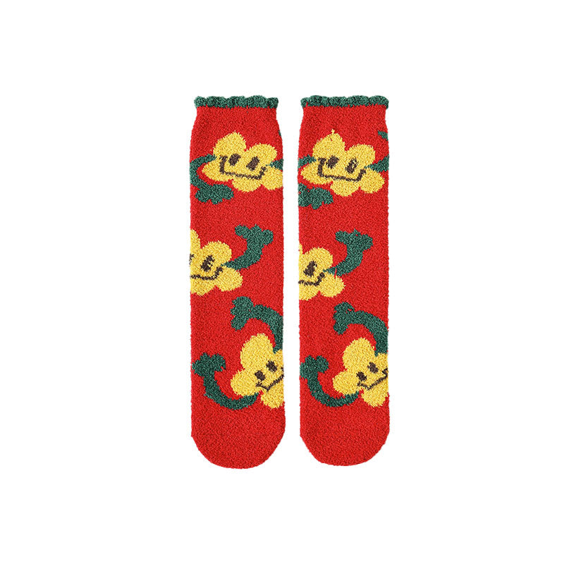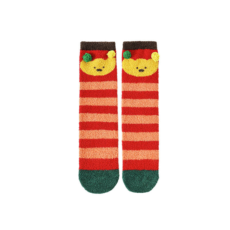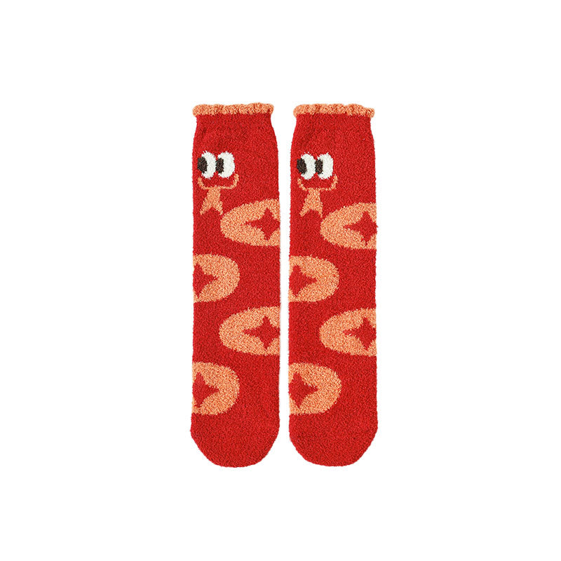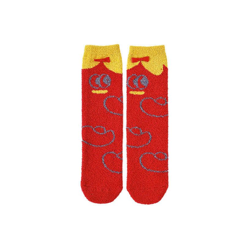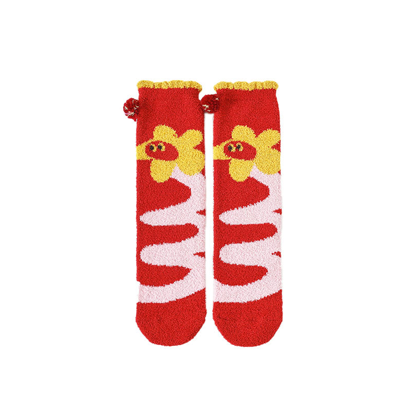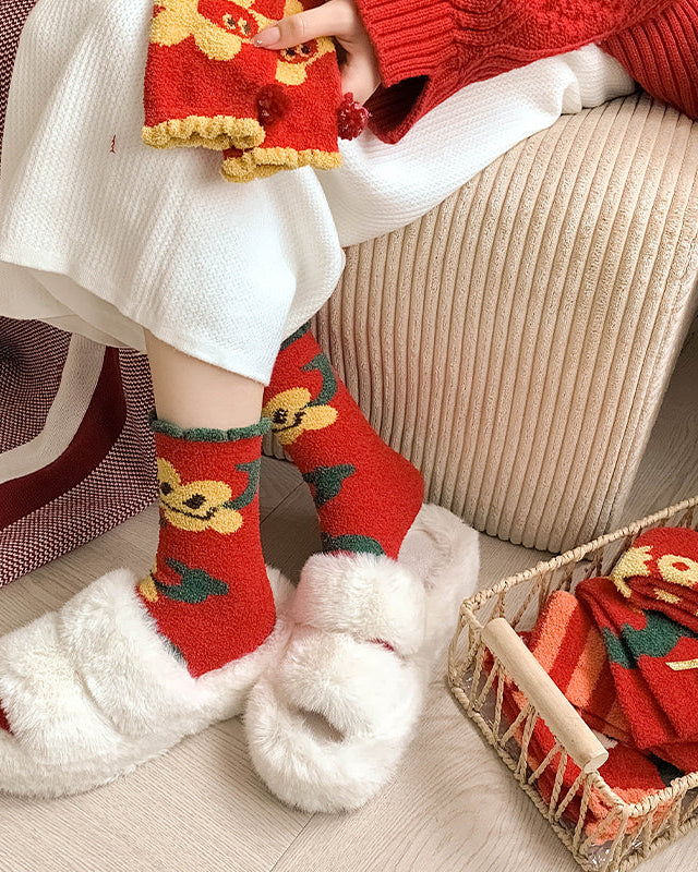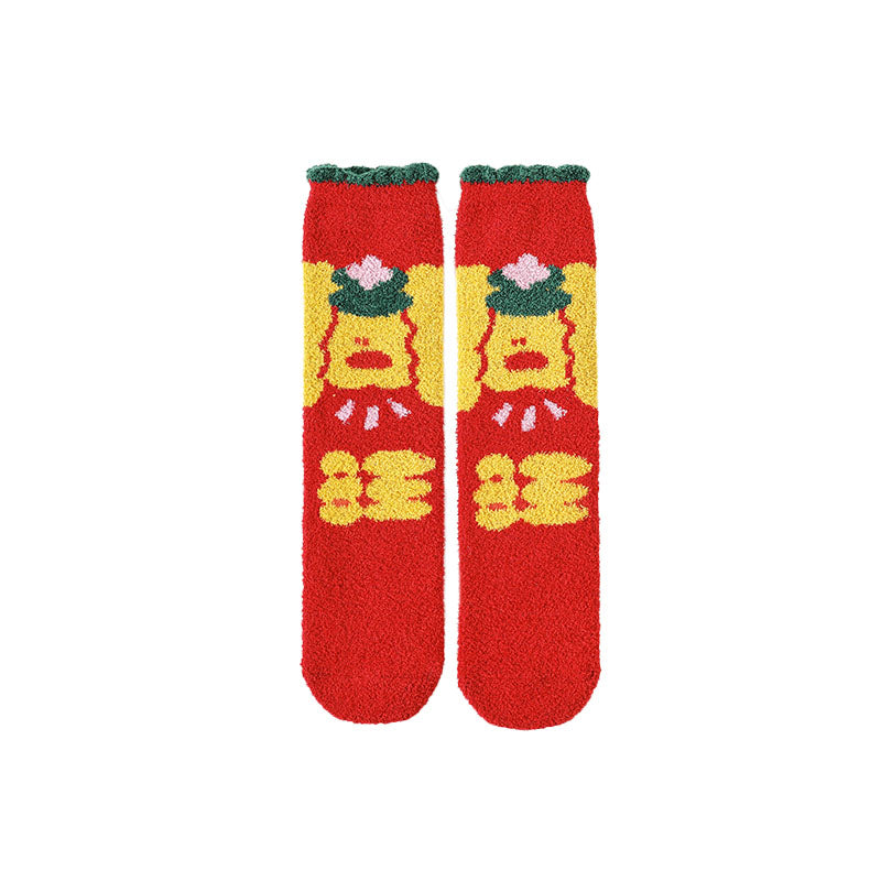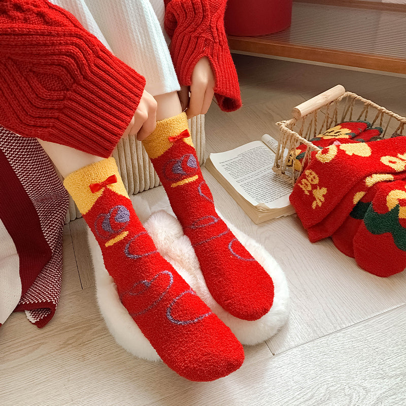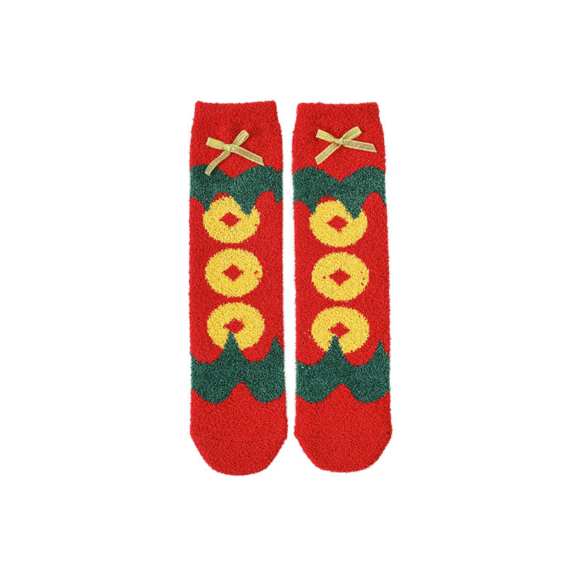 Sweetnana新年ファミリーソックスは、楽しいホリデーのくつろぎタイムにぴったりの、厚手でふわふわのソックスです。赤とゴールドの配色、ジャカード織りのラッキーモチーフ(くまの顔、コインやリボン、ストライプ)、やわらかい伸縮性のある履き口で、大人も子どもも暖かく、写真映えし、快適に過ごせます。親子お揃いで履いて、家族のぬくもりと幸運を感じるシーズンをお楽しみください。
