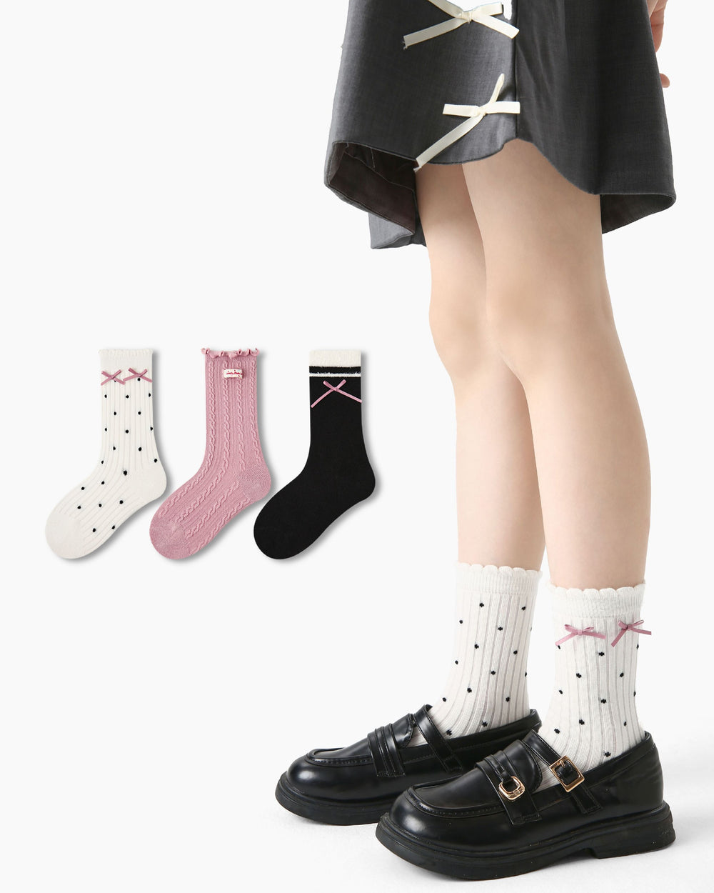 The Sweetnana Pink Bubble Crew Socks Set brings together soft colors and playful details for everyday sweetness. This 3-pair collection includes polka-dot socks with pink bow accents, a delicate pink cable-knit style, and a classic black pair finished with a cute bow detail—balanced, charming, and easy to wear.