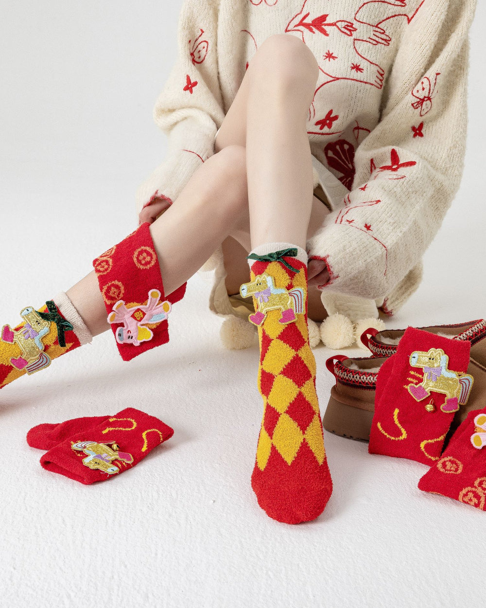 Celebrate the season with the Sweetnana CNY 3D Horse Lucky Crew Socks — a charming blend of festive joy and everyday comfort. Designed with a 3D fabric horse patch, fluffy pom-pom detail, and traditional lucky motifs, these socks bring playful energy and auspicious meaning to every outfit.