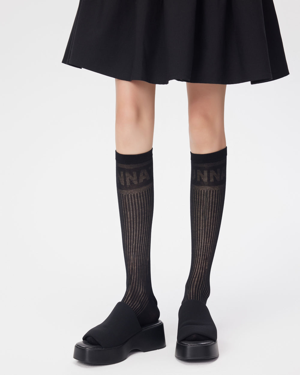 The Sweetnana Sheer Stripe Letter Knee High Socks bring a modern street twist to classic legwear. Crafted from high-stretch polyamide and spandex, these socks feature a semi-sheer striped texture with tonal letter detailing that adds a subtle yet stylish edge.