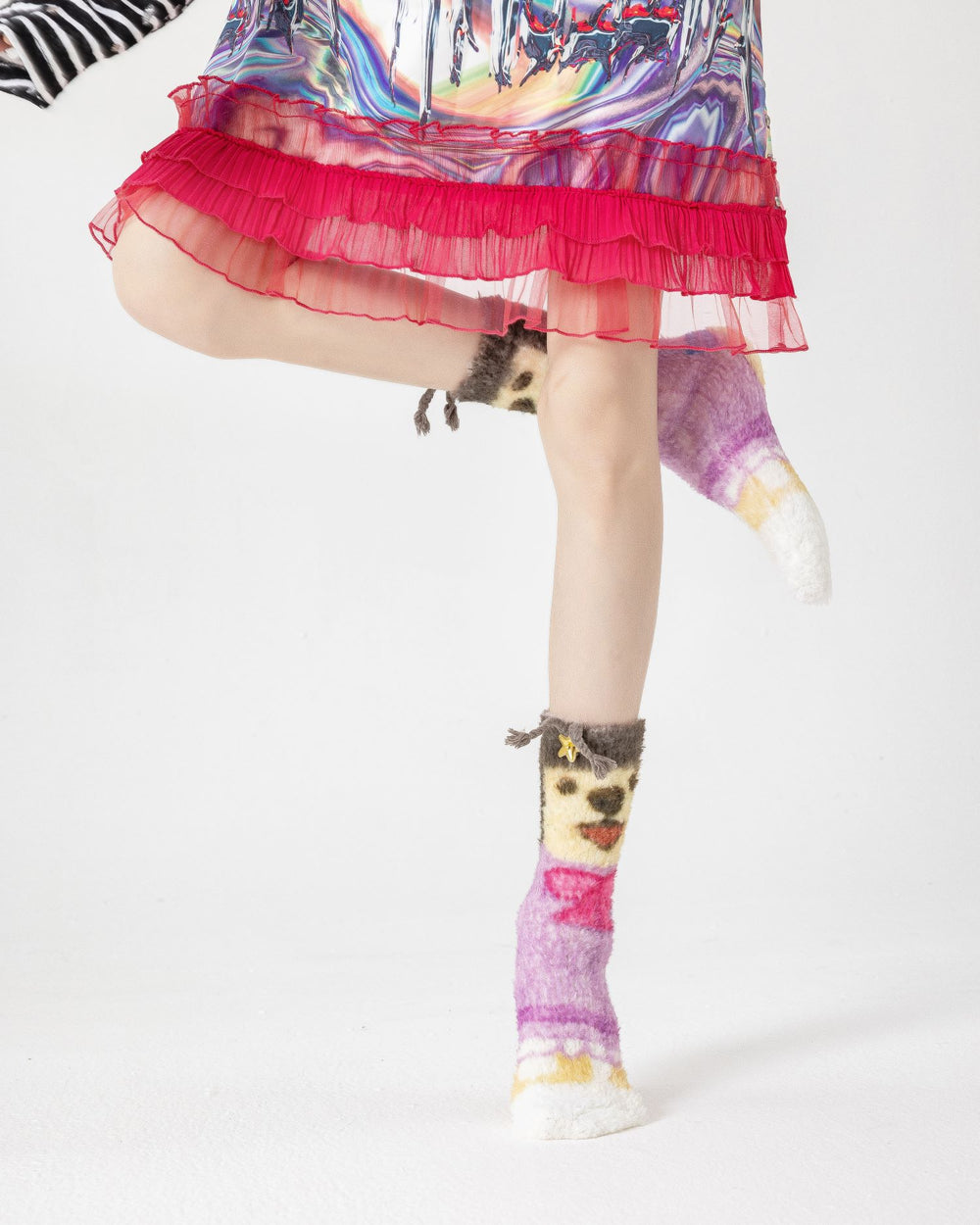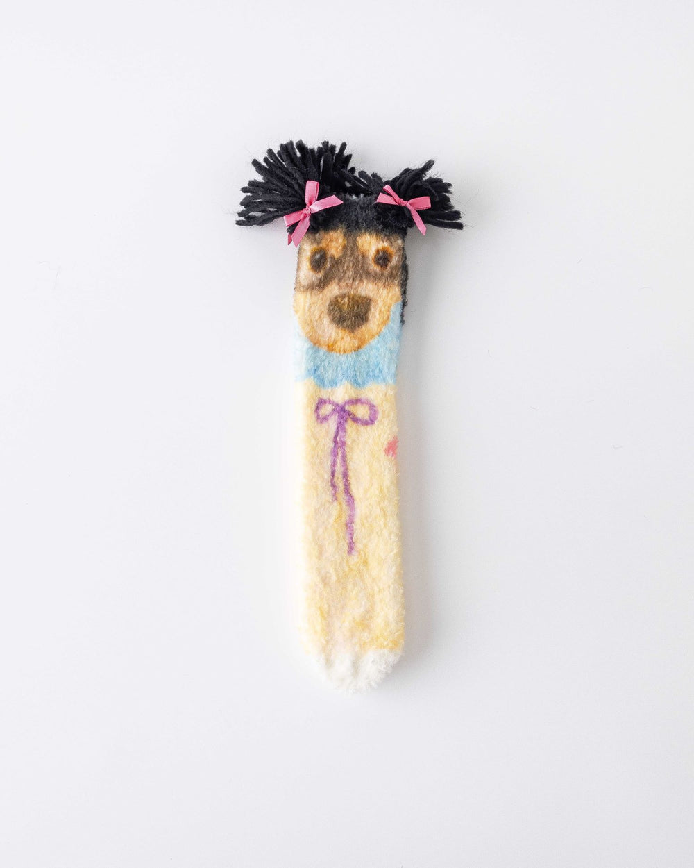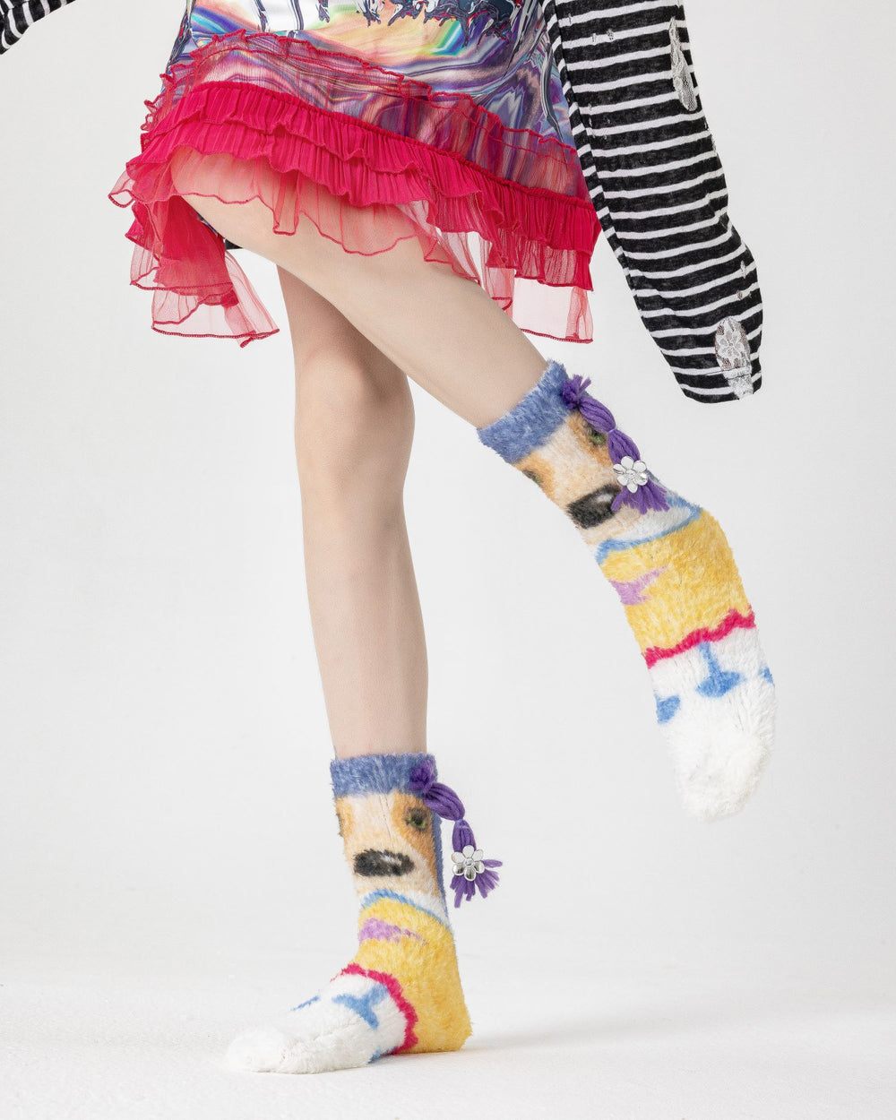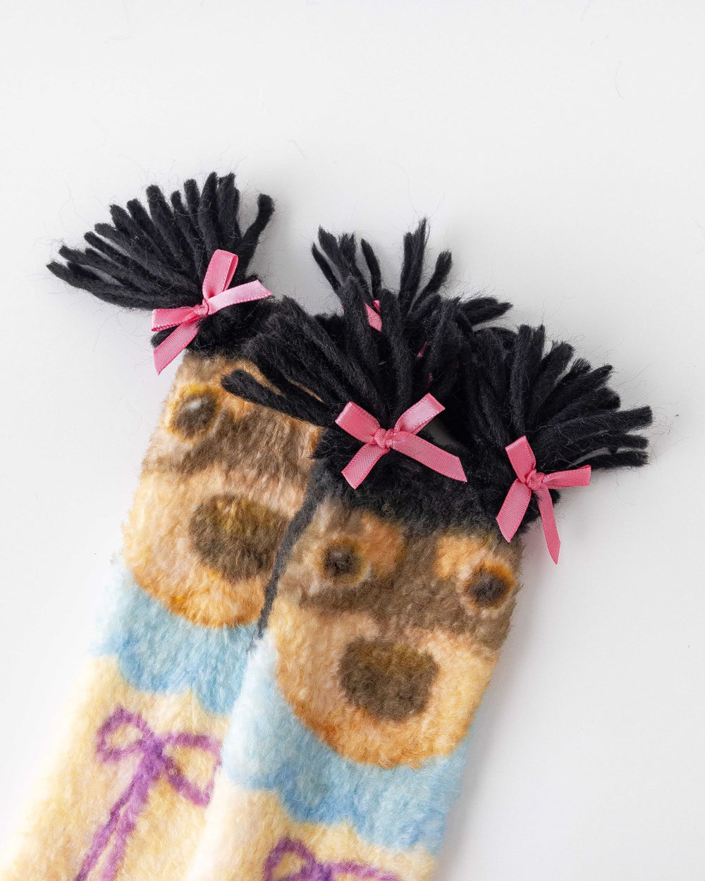 Sweetnana 趣味狗狗襪子為您的家居服增添俏皮感。採用可愛的 3D 狗狗圖案搭配蝴蝶結點綴及柔軟絨毛細節,讓保暖變得有趣又時尚。襪子由 98% 優質聚酯纖維和 2% 氨綸製成,兼具柔軟、彈性與溫暖,是秋冬在家或室內休閒的理想選擇。