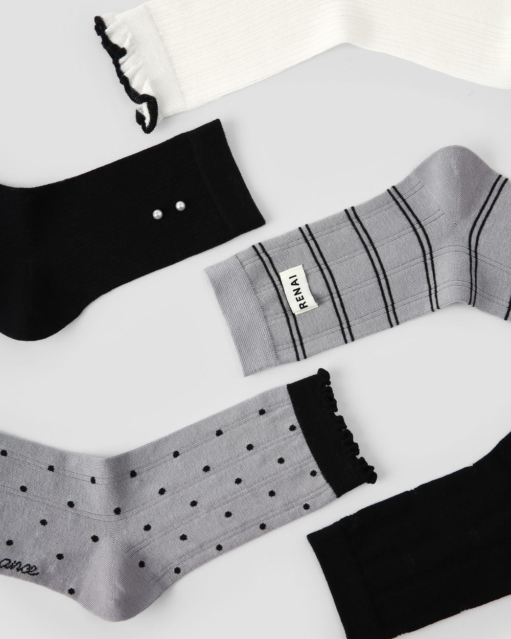 從視覺上看,這個系列在結構與柔和之間取得平衡:俐落條紋、柔和圓點紋理、精緻蝴蝶結刺繡,以及低調的珍珠點綴。每一雙都維持在灰/黑/白的色調範圍內,輕鬆搭配辦公鞋、瑪莉珍鞋、樂福鞋或休閒球鞋。