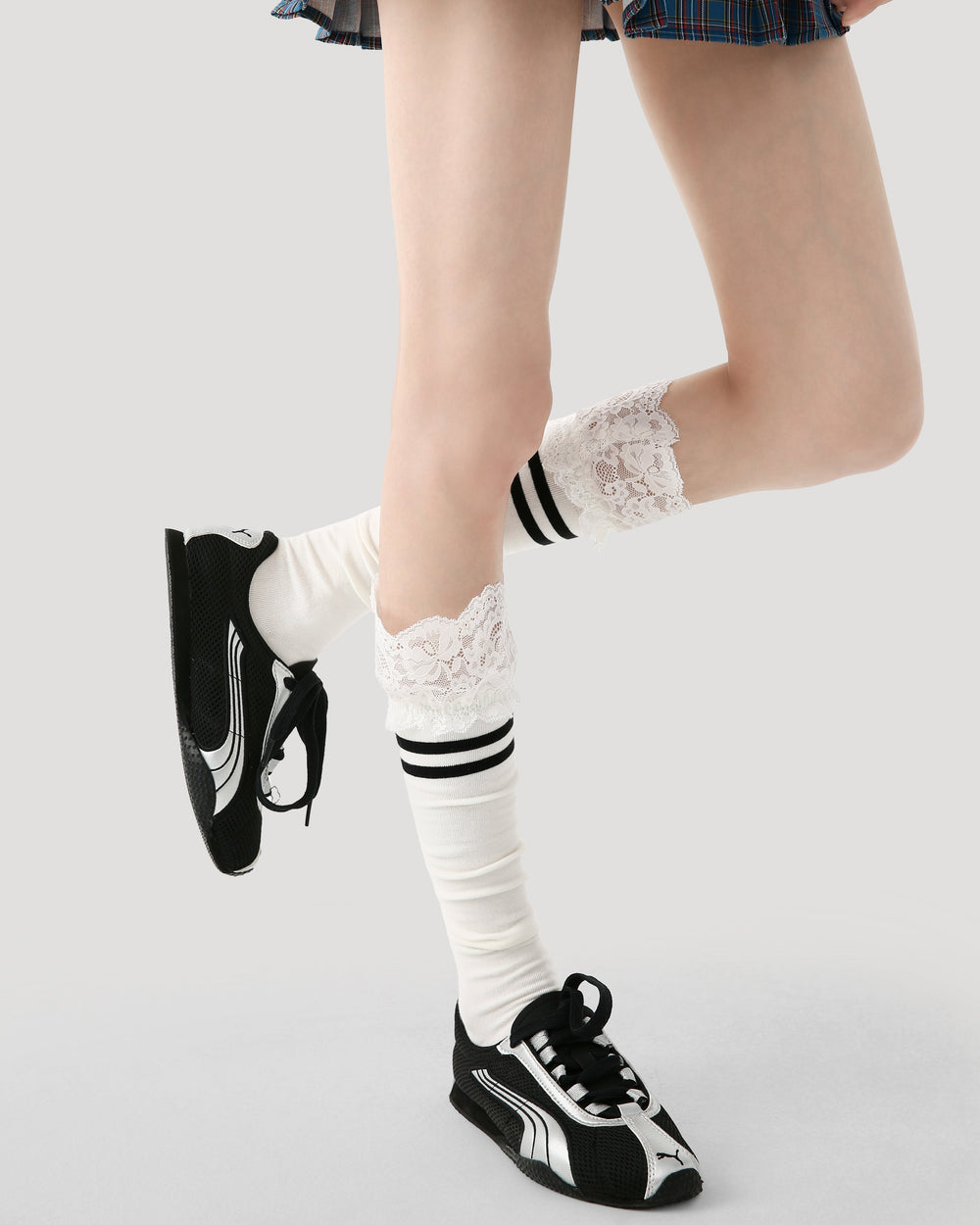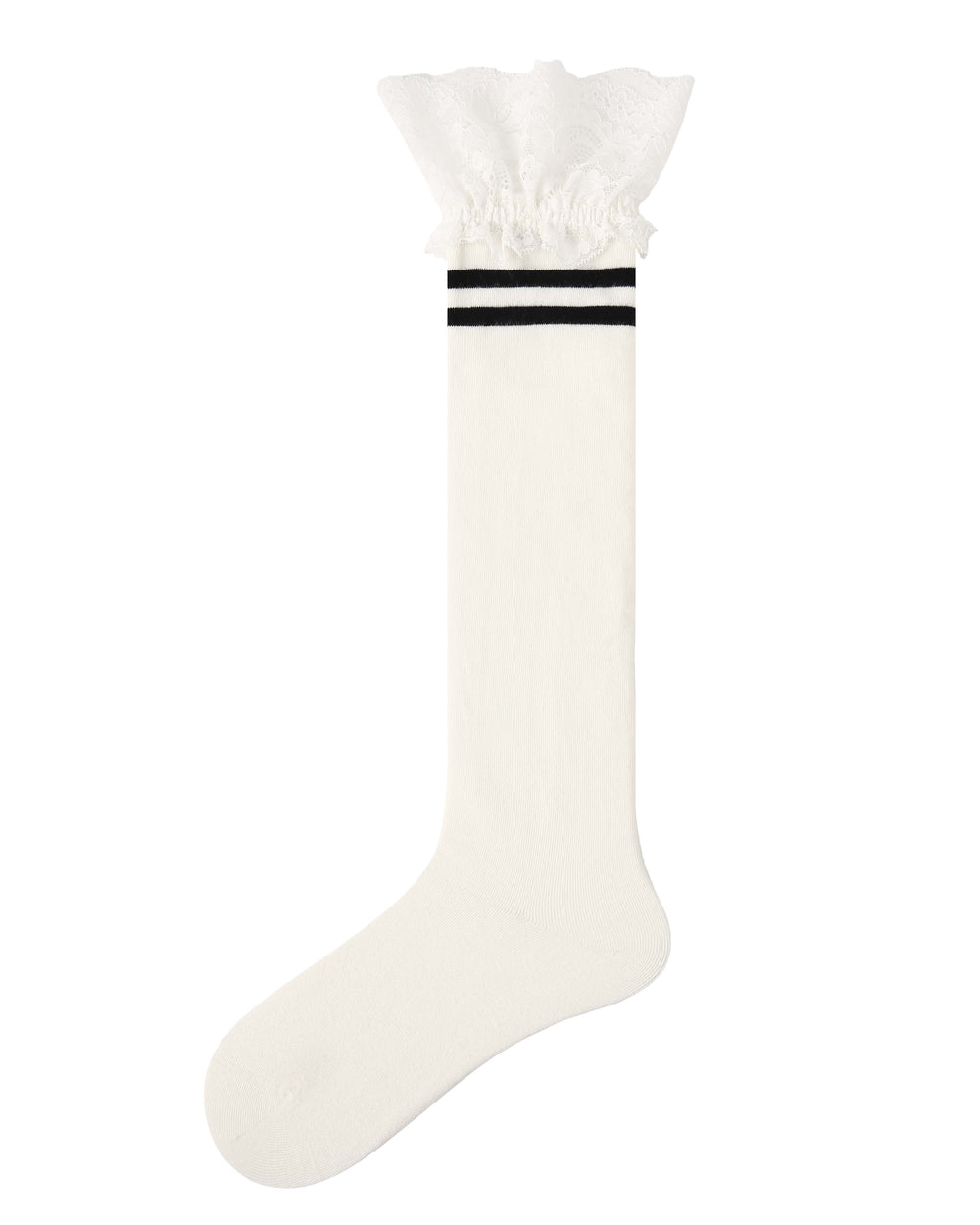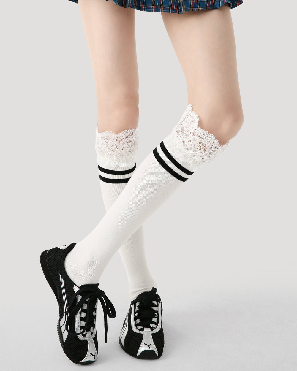 Sweetnana 蕾絲拼接條紋及膝襪將浪漫與運動風格完美結合。優雅的蕾絲襪口搭配經典雙條紋,營造俐落學院風格,輕鬆提升裙裝、制服與樂福鞋的時尚感。高級精梳棉混紡材質帶來透氣溫暖與雲朵般柔軟舒適,彈性回復力佳,襪子整天保持服貼俐落。